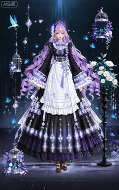 1girl, birdcage, cage, long hair, dress, butterfly, blonde hair, bug, solo, flower, black dress, full body, jewelry, earrings, standing, purple eyes, hair ornament, looking at viewer, long sleeves, drill hair, frills, bow, very long hair, white flower, blue butterfly, brown footwear, long dress, shoes, black footwear, curly hair, ribbon, apron, gem, red lips, bowtie, hair flower, frilled sleeves, lolita fashion, holding, wide sleeves, bird, 6