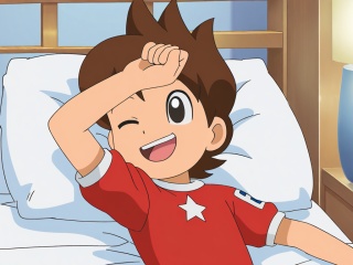 <lora:Amano Keita_XL:1>,explicit,Amano Keita,(best quality:1),(best detail:1),(masterpiece:1),male focus,bedroom,lying in bed,1boy,solo,child,(petite:1.1),brown hair,short hair,(black eyes:1.1),(5fingers:1.1),perfect hands,(red short sleeves with white star print:1.1),arm_above_head,;d,correct anatomy,upper_body,looking_at_screen,available light,animation style,(incredibly absurdres:2),