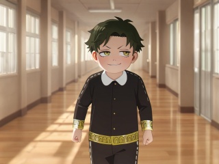 <lora:Damian_Desmond_XL:1>,explicit,Damian Desmond,(best quality:1),(best detail:1),(masterpiece:1),school corridor,elegant walking,male focus,1boy,solo,(toddler:1.2),(petite:1.3),dark green hair,short hair,yellow eyes,perfect eyes,(5fingers:1.1),perfect hands,black school uniform with phnom penh,black school uniform shorts,smug,correct anatomy,available light,full_shot,(realistic:1.6),(incredibly absurdres:2),
