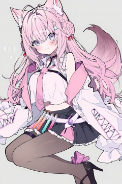 1girl,hakui koyori \(1st costume\),hakui koyori,virtual youtuber,animal ears,pantyhose,tail,pink hair,skirt,high heels,long hair,hexagon hair ornament,solo,black skirt,wolf tail,braid,wolf ears,looking at viewer,necktie,smile,black footwear,hair bun,shirt,lab coat,crown braid,test tube,pink necktie,white shirt,braided bun,animal ear fluff,blush,white coat,pleated skirt,coat,pink tail,purple eyes,character name,hair between eyes,closed mouth,pumps,wolf girl,simple background,grey background,brown pantyhose,off shoulder,frills,strappy heels,ankle bow,collared shirt,<lora:Mochi_style-000085:0.9>,