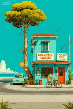 复古治愈系插画风格,街角,人物,car,tree,街角,海,