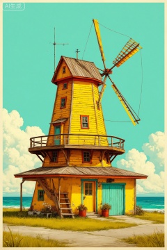 主体描述:一座黄棕色的复古海滨风车屋,复古治愈系插画风格,高饱和度撞色搭配