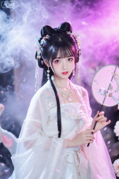 胶片摄影,镜头语言,淡彩,暗调,氛围低光,个性视角,奇妙融合意境,一位美人,真人,有着倾国倾城之貌、皮肤白皙嫩滑, 仿Bjd风格,头上戴着繁华的饰品,清冷感,有洛丽塔支离破碎感, 透光感,玻璃感,洛丽塔御姐范,梦幻色系,精美繁复服饰配饰,神秘,梦核,高级。高级,烟雾朦胧美,明亮,高颜值,高对比度,虚焦,既视感,情绪氛围感拉满,暗朦,光朦,粒子高噪点,胶片颗粒质感,层次丰富,写意,朦胧美学,光的美学,lomo效果,超现实,高级感,杰作半身照、高级质感网红照,高颜值清纯可爱无辜长相、绝美双眼,精致五官、发质滑顺有光泽、瓷白皮肤。- 背景细节:萌系古风少女感背景。- 人物细节:精致女性,冷白皮,黑色碎发、双包头,精致古风唯美发型,水汪汪大眼睛,灵动、慵懒、呆萌、纯欲、俏皮、可爱、傲娇、甜美,仿佛会说话的眼睛,符合古风的精致妆容、浅浅的眼影;姣好身材、穿着唯美可爱白色古风汉服少女服装,整体呈现萌系古风贵族少女感,拿着漂亮的团扇、自然动态姿势、浮夸精致的发饰、项链及耳环,令人惊艳的构图、粉色氛围感,造像美人