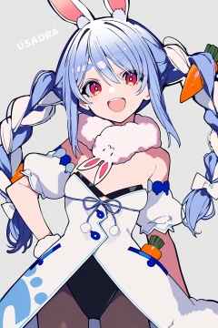 masterpiece,best quality,newest,absurdres,highres,safe,1girl,virtual youtuber,usada pekora,usada pekora \(1st costume\),animal ears,solo,rabbit ears,food-themed hair ornament,carrot hair ornament,gloves,long hair,black gloves,blue hair,v,braid,hair ornament,twin braids,pantyhose,breasts,don-chan \(usada pekora\),open mouth,fur-trimmed gloves,animal ear fluff,white hair,fur trim,looking at viewer,small breasts,multicolored hair,dress,rabbit girl,leotard,two-tone hair,character name,red eyes,detached sleeves,fur scarf,smile,twintails,black leotard,grey background,white dress,simple background,black pantyhose,hair between eyes,leotard under clothes,hand on own hip,thick eyebrows,arm cuffs,strapless,teeth,short sleeves,puffy sleeves,coat dress,upper teeth only,puffy short sleeves,strapless dress,carrot,short eyebrows,cowboy shot,white coat,:d,<lora:Mochi_style_v1-000072:0.85>,