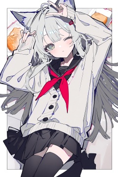 masterpiece,best quality,newest,absurdres,highres,safe,1girl,solo,petite,loli,(rosmontis_(arknights):1.4),thighhighs,skirt,black thighhighs,one eye closed,neckerchief,red neckerchief,long hair,pleated skirt,long sleeves,sailor collar,black skirt,cardigan,black sailor collar,ahoge,feet out of frame,school uniform,blush,looking at viewer,v,white cardigan,serafuku,parted lips,buttons,arm up,miniskirt,food,border,hair ornament,<lora:Mochi_style_v1-000072:0.85>,cute,very awa,