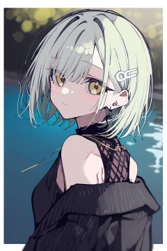 masterpiece,best quality,newest,absurdres,highres,safe,1girl,solo,petite,wakaba mutsumi,green hair,yellow eyes,white hairclip,(depth of field:2),blurry,border,outside_border,from_side,(bokeh:1.2),water,lake,upper_body,dappled sunlight,looking_to_the_side,bare shoulders,jewelry,necklace,earrings,expressionless,looking_afar,<lora:Mochi_style_v1-000072:0.85>,