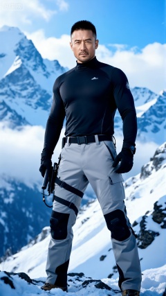 一位面容刚毅、发型短发、眼神坚定的中年男子。他身着深色功能性上衣,搭配浅灰色工装裤(裤腿处带有护膝与绑带设计),并佩戴黑色手套,手持装备。他矗立于雪山场景中,背景是云雾缭绕的蓝天。