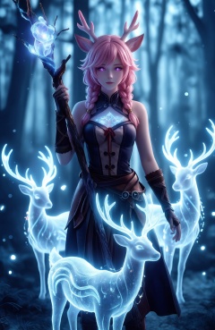 This is a digital art piece featuring a fantasy character in a magical forest setting. The central figure is a young woman with pink hair styled in twin braids, adorned with pink deer-like antlers. She has large, expressive purple eyes and fair skin. She wears a black, sleeveless top with metallic arm guards, and a brown, waist-length skirt with a red ribbon tied around her waist. Her outfit is detailed with textures that suggest a combination of leather and fabric.She is standing in a forest with tall, blurred trees in the background, illuminated by a soft, blue light that creates an ethereal atmosphere. Surrounding her are three translucent, blue, glowing deer, which appear to be magical or spectral. These deer are positioned to her left, right, and slightly behind her, with one deer directly in front of her chest. The deer have a luminescent quality, with glowing outlines and subtle light trails, adding to the magical effect.The character is holding a gnarled tree branch with her right hand, which is positioned near her head. The branch has a rough texture, contrasting with the smooth, glowing appearance of the deer. The overall color palette of the image is dominated by cool blues and purples, enhancing the mystical and otherworldly atmosphere. The lighting and shadows are expertly used to create depth and emphasize the magical elements. The artist's style is highly detailed and realistic, with a focus on fantasy and magical realism.