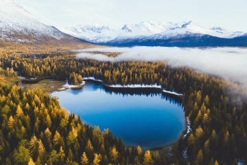 filmmood, a high-angle view of a heart-shaped blue lake surrounded by a golden and green forest, snowy peaks in the distance with low-lying morning mist, clean and crisp light, capturing the vibrant yet calm awakening of nature.