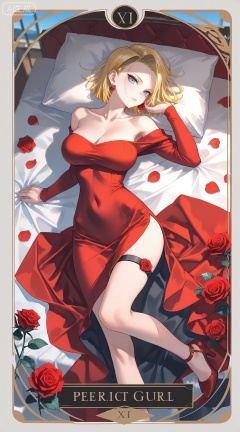 android 18, blonde hair, short hair, blue eyes, 1girl, breasts, dress, solo, red dress, high heels, cleavage, rose, flower, jewelry, earrings, looking at viewer, red footwear, bare shoulders, off shoulder, red flower, pillow, collarbone, petals, lying, red rose, covered navel, off-shoulder dress, side slit, large breasts, long sleeves, closed mouth, from above, makeup, on bed, copyright name, strapless, rose petals, bed sheet, thigh strap