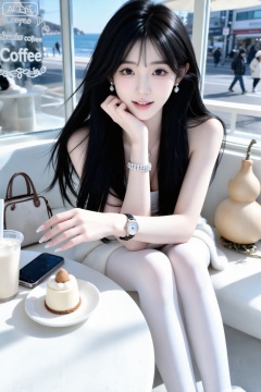 High-definition picture quality, real-person photography, professional shooting. A 19-year-old girl with long black hair, a Korean-style hairstyle, and a tall figure. She is a cool white-skinned internet celebrity. She looks at the camera with a lively expression. She is sitting in the store with milk tea and a piece of exquisite mousse cake on the table, a mobile phone and a bag, with a natural posture. The girl is wearing reasonable winter clothes, earrings, and exquisite manicures. This is a transparent coffee shop. There are words and fresh patterns such as "Coffee" outside the window. The overall atmosphere is fresh and daily, full of a sense of life on the city's winter streets. The seaside, wide-angle lens, side-light shot creates a full atmosphere; the expression is relaxed and natural, creamy white skin, naturally relaxed, girlish online shooting, focusing on the eyes, the beauty with unique charm, captured instantly, and the movements are casual; soft colors, smooth edges of the character's outline, fresh, the highest quality texture, rich layers, natural expression and limbs, clear makeup, blurred background to highlight the subject, gentle style and visual tension. Interactive props: diamond bracelet,