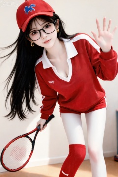 Real photography, indoor retro sports atmosphere, long black hair (smoothly hanging, with natural luster), red baseball cap (with blue pony embroidery, adding a sense of sports fashion), red color-blocked Polo collar sweatshirt (white contrasting details, soft texture, casual fit) sweatpants, red stockings (with white brand logo, echoing the color of the hat and sweatshirt, improving the overall sense of coordination), wearing black glasses (adding culture Art and sporty feel) and gold hoop earrings (exquisite and small, embellished with details), tennis racket (red and black color matching, consistent with the clothing style, enhancing the sporty atmosphere), standing and waving with the tennis racket in both hands, in a warm light room (the background is simple, creating a retro sports atmosphere), the overall color is bright and energetic, revealing the fashionable texture of retro sports; the softness of long hair, the vitality of red clothing, the fashion sense of baseball caps, tennis The sense of movement and the atmosphere of the warm-lit room blend into a unique indoor retro sports atmosphere. The bright colors and sports elements form a fusion of vitality and fashion. The atmosphere is full, the composition is tilted, the face is beautiful, the ultra-clear picture quality, the makeup is exquisite, the accessories are exquisite, the makeup is cute, gentle and generous, the facial features are exquisite, the face is clear, (movie-level surface light: 1.6), (ray tracing: 1.5), (cold white skin and comic texture) Smooth skin: 1.7), (The character has the best bones: 1.2), (Internet face: 1.6), perfect figure, perfect figure, Morandi color matching, high-looking Internet celebrity, INS style, childish face, 20-year-old girl with pointed chin, balanced proportions of three courts and five eyes, petite body, delicate porcelain supple skin, cold white skin, random movements, side light, random angle shooting, overall there is a lot of uncertainty, but it looks good.