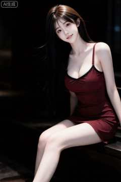 Masterpiece, best picture quality, high quality, (black hair: 1.4), (extra long legs: 1.3), (smooth white thighs: 1.4), (big breasts: 1.4), (beautiful face: 1.4), impressive body, D cup, 1girl,一个女孩,年轻女性,棕色长发(自然垂落,有光泽感),身穿酒红色吊带连衣裙(领口有黑色镶边),表情俏皮可爱黑长直深色长发系带束缚,年轻娇小,发丝呈现出自然的蓬松感与垂坠感,长发散落于肩头两侧,几缕发丝拂面,冷白皮气质美女,纯欲风,皮肤白皙,偶像气质,fairskin,光滑,水润质感,陶醉,,,背景为室内环境(偏暗色调),写实风格,近景,时尚、优雅、明艳氛围 。