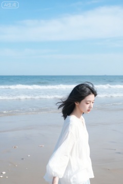 Depicting a serene coastal scene with a young woman in the foreground. The photograph captures a young Asian woman with medium-length black hair,styled in a tousled,wind-blown manner,standing at a quiet shallow beach with gentle lapping waves and smooth wet sand. She wears a loose,long-sleeved white cotton blouse that flows gently in the sea breeze,contrasting softly against the blue ocean and pale beige sand. The sky is clear and bright blue,with wispy white clouds and a distant soft horizon where the sea meets the sky. The shore is peaceful,with small seashells scattered on the sand and gentle ripples in the shallow water,suggesting an expansive,calm coastal landscape. The composition emphasizes a sense of tranquility and harmony with the ocean,with the woman’s delicate,almost ethereal presence blending seamlessly with the serene seaside beauty. The photograph evokes a timeless,peaceful quality,blending realism with a touch of gentle enchantment.,