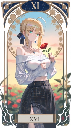 1girl,solo,skirt,off shoulder,off-shoulder sweater,jewelry,white sweater,holding flower,necklace,bare shoulders,holding,sweater,breasts,black skirt,plaid skirt,collarbone,plaid,blurry background,crop top,blurry,midriff,long sleeves,large breasts,