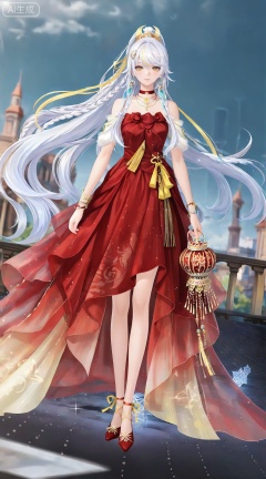 1girl, dress, red dress, solo, jewelry, long hair, full body, red choker, necklace, hair ornament, bare shoulders, holding, bracelet, constellation, earrings, looking at viewer, choker, red footwear, standing, brown eyes, crown, 5