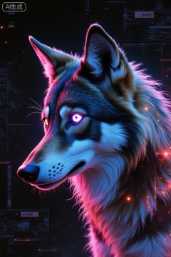 in the style of cksc, 90s_melancholy, retro, Digital drawing portrait of a wolf illustrated in hyper-detailed neon cyberpunk style, close-up framing, with a bold twist: the wolf is composed entirely of holographic light projections. Its form flickers and refracts, with layered neon outlines in magenta, cyan, and electric blue creating a translucent, glitching silhouette with chromatic aberration. Facial features are sharp but fragmented, as if rendered by a malfunctioning AI display. Fur is replaced with animated light textures. The eyes glow intensely, projecting thin beams of light forward, suggesting awareness and surveillance. Lighting is high-contrast and synthetic, with strong glow effects, bloom, and chromatic aberration. Background is a dark futuristic void with floating grids, broken pixels, and digital noise. The mood is intense, otherworldly, and slightly unsettling, blending animal instinct with digital consciousness. Style leans toward futuristic concept art and synthwave aesthetics, ultra-sharp details, high saturation, cinematic cyberpunk illustration.