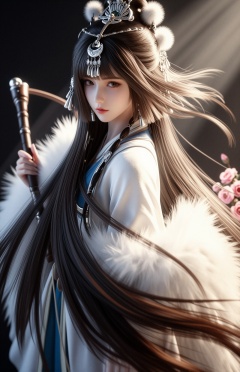 YY Anime style,淡彩,个性视角,场景随机,古风美人,皮肤白皙嫩滑,倾国倾城容貌,含香公主,古风华丽异域配饰,配饰繁复有特点,头饰带毛球流苏,五官精致立体,身着冬季古风白蓝色异域风情衣物,衣物华丽有特色,灵动可爱,高对比度,虚焦,高颜值,既视感,情绪氛围感拉满,暗朦,光朦,泛白,褪色,漏光,胶片颗粒质感,层次丰富,写意,朦胧美学,光的美学,lomo效果,超现实,高级感,杰作真人摄影,古风美女,摆pose。现代风格。 故事感山海经巫山神女,皮草,复古装饰,银饰,金属额饰,碎发随风摆动,复古发饰,超长流苏,很多细碎辫子油画风唯美朦胧美手拿皮鞭神秘,安静,清冷端庄清冷优雅知性清冷感妆容绝美少女妩媚y2k时尚精致服饰温柔大美人黑茶色长发,发型分层剪裁,内层过肩直发垂顺,外层及耳短发呈蓬松弧状包裹内层,发尾保留整体长发垂坠感,内外层通过层次落差形成立体轮廓。避免齐长发型、拒绝均匀发尾、不要整体短发。发梢微卷。 从容英气自带疏离感。唯美。艺术。大师级审美。二次元。晕染,渲染。大师级构图,大师级配色,大师级打光,非传统构图的艺术,耀变+反射,年代,特写,微光,宿命感,故事感,宿命感,发丝飘扬飞舞丁达尔效应,鲜花,粉色玫瑰花,簪花少女,特写,渐变磨砂质感,双重曝光,胶片,弥散光学,优雅动态角度,高级感,淡雅简约,故事感