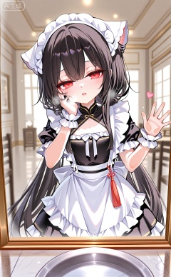 1girl, solo,maid dress,white frilled apron,black maid headdress,lace trim,cleaning glass,earnestly expression,body pressing against glass,holding rag,white rag,glass with breath fog,heart shape on breath fog,draw heart on fog,viewer through glass,glass perspective,glass reflection,slender limbs,pressing cheek on glass,fingers on glass surface,indoor scene,soft light,glass texture,foggy glass detail,anime line art,soft shading