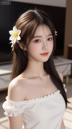 A beautiful young East Asian woman with long, wavy dark brown hair adorned with a white plumeria flower featuring a yellow center, wearing a delicate off-shoulder white top with ruffled details, subtle makeup including soft pink blush, defined eyelashes, and glossy coral-pink lips, glowing skin with a natural dewy finish, small gold necklace with a minimalist pendant, standing indoors in a modern space with marble flooring and a sleek black wall in the background, soft ambient lighting enhancing her radiant features, gentle expression with direct eye contact, high-resolution photo-realistic portrait with lifelike texture, fine hair strands, and cinematic depth — ar 3:4 --v 6 --style raw --lighting soft indoor lighting with warm highlights and natural shadows