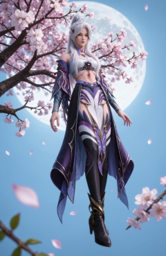 <lora:百炼成神3-星剑Pony:0.7> 1girl, long hair, white hair, ponytail, hair ornament,brown eyes, bare shoulders, crop top,midriff, navel, jewelry, facial mark, detached sleeves, thighhighs,high heels,boots,, masterpiece,best quality,solo,1girl,upper body,petals,looking at viewer,moon,branch,cherry blossoms,flower,extreme aesthetic,(quasarcake:0.7),masterpiece,best quality,good quality,newest,very aesthetic,absurdres,A shot with tension,(Visual impact,giving the poster a dynamic and visually striking appearance:1.2),impactful picture,offcial art,colorful,splash of color,movie perspective,