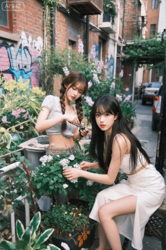 masterpiece, best quality, hyper-realistic photo, 东亚美少女, UHD, 画面捕捉了一个充满生命力与叙事感的生活瞬间。伦敦红砖巷充满艺术气息的涂鸦墙上,无数绿植与鲜花如瀑布般倾泻而下,构筑成一座垂直的空中花园。在前景的悬挑露台上,两位东亚少女正在细心地打理这些植物。一位扎着鱼骨辫的少女身穿高腰的露脐短上衣,随着她修剪枝条的动作,她那纤细的腰肢在阳光下熠熠生辉,展现出极高的视觉焦点。另一位少女留着整齐的齐刘海长直发,清新的妆容在午后的散射光下显得格外纯净。她身穿一件高开叉的白色丝绸裙,正蹲下身子整理脚边的花盆,那一双笔直纤细的长腿在绿植的掩映中若隐若现。午后明亮的侧光在叶片上留下了迷人的光晕,空气中漂浮着泥土与花草的清新芬芳。画面结构严谨,从近景的园艺细节到背景中繁忙的街道,信息量丰富且错落有致。