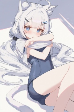 <lora:nai4.5zhengliu-ckxl0.2_v2:0.9>,high resolution,aesthetic,excellent,medium resolution,newest,year 2025,1girl,solo,cat ears,animal ears,white hair,long hair,twintails,low twintails,ahoge,hair ornament,hairclip,blue eyes,blush,cat tail,tail,school swimsuit,old school swimsuit,swimsuit,one-piece swimsuit,shirt,white shirt,short sleeves,gym shirt,clothes lift,shirt lift,**********,holding shirt,arms across chest,flat chest,petite,simple background,white background,light rays,shadow,sunlight,thighs up,looking at viewer,loli,petite,