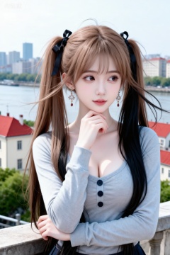 整体构图融合浪漫主义与清冷情绪风格,突出人物立体轮廓与优雅气质。强透视,镜头感,画面张力微距拍摄,一位长相呆萌可爱的钝感女生,纯欲风,表情可爱,年轻娇小,冷白皮气质美女,皮肤白皙,偶像气质,光滑,千金大小姐气质,浅棕色双马尾,浅棕色直部分深色长发系带束缚,年轻娇小,发丝呈现出自然的蓬松感与垂坠感,长发散落于肩头两侧,几缕发丝拂面,带着精致耳饰,眼神微微望向画面右侧,右手轻托下巴、左臂交叉于身前,整体姿态沉静又带点若有所思的氛围感。穿着一件休闲式的长袖上衣,领口处还能看到几颗深色纽扣,版型修身,贴合身形。背景是户外的城市开阔地带(大概率是露台、江边或观景台),背景做了虚化处理,能隐约看到浅色的建筑物、红顶房屋、成片绿植,傲人身材,D cup,美颜全开,光滑油亮水嫩的皮肤