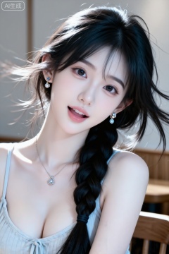 帮我生成图片:这是一张采用INS风的绝美人像情绪写真照片,以超清晰的单反相机效果呈现,拥有50mm焦距和32K超分辨率的最高等级画质。画面中,一位有着幼态脸、三庭五眼比例均衡、尖下巴的26岁东方美女,她是江南气质的高颜值网红,身材娇小,皮肤呈现偏冷的冷白皮,肤质白透且如细腻陶瓷般水嫩,肌肤纹理细腻。她身着图片一样的上衣,戴着精致的项链和耳钉,长发梳成一个大辫子放于一侧,两侧有碎发,发丝柔亮垂落且呈现出自然的蓬松感与垂坠感,部分发丝虚化营造出呼吸感。她在西餐厅内,背景是浅咖色的纯木质,在强烈阳光的照射下,伦勃朗光加强了侧光效果,面部立体,整体暗调高光,色彩淡雅生动,对比强烈。她头稍微歪一点,做着可爱的表情动作,随机地摆着各种各样的姿势,表情可爱,眼神灵动,情绪甜美、优雅又神秘,妆容是清透的自然裸妆,尽显软萌、俏皮、慵懒又纯欲的甜美少女系风格,画面充满故事感、高级感与梦幻氛围,光影、表情、动作随机而合理,整体为莫兰迪配色,写实与写意相结合,多样化的构图使画面充满独特韵味。比例9:16。傲人身材,D cup,美颜全开,光滑油亮水嫩的皮肤