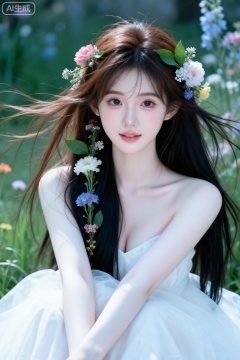 背景充满花草树木草,超清晰画质,妆造精致,饰品精巧,棕色长发上编织许多鲜花和叶子搭配,头发和鲜花花巧妙结合,身着白色飘逸长裙蓬松极简风格,细节完美,五官精致,突出头发凌乱美,面部清晰,清冷调。日常快照风格,非精心构图,非专业打光。(电影级面光:1.6),(光线追踪:1.5),(冷白皮漫感质感的光滑皮肤:1.7),(人物有最好的骨相:1.2),(网感脸:1.6),(网感妆:1.6)身材完美,莫兰迪配色,高颜值网红,INS风,幼态脸,19岁女生尖下巴,三庭五眼比例均衡,细腻陶瓷水嫩肌肤,偏冷白皮,随机的妆容,随机的饰品,随机的动作,侧光,发丝轻飘,凌乱,随机角度拍摄,总体有很多的不确定性,但又好看,