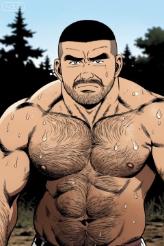 一位身材健硕的中年男性,寸头造型,留有胡须。他赤裸上身,肌肉线条明显且带有水珠,整体画面呈现出硬朗、野性且充满质感的户外氛围。,田龟源五郎风格