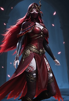 (upper_body:1.2),(looking at viewer:1.1),masterpiece,(best quality),smog,Dark room,dim lighting,peach blossom,falling petals,<lora:YQ_Illustrious光辉v5_马小桃_服装2_V1:0.8>,q1528437228,1girl,solo,long hair,red hair,red eyes,dress,cape,belt,boots,jewelry,red dress,thighhighs,earrings,colored sclera,black sclera,high heels,torn clothes,tattoo,red cape,ascot,brown eyes,facial mark,gloves,armor,helmet,horns,glowing eyes,red sclera,thigh boots,high heel boots,white ascot,cloak,black footwear,mouth mask,mask,hood up,veil,hood,