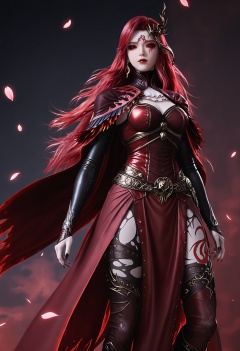 (upper_body:1.2),(looking at viewer:1.1),masterpiece,(best quality),smog,Dark room,dim lighting,peach blossom,falling petals,<lora:YQ_Illustrious光辉v5_马小桃_服装2_V1:0.8>,q1528437228,1girl,solo,long hair,red hair,red eyes,dress,cape,belt,boots,jewelry,red dress,thighhighs,earrings,colored sclera,black sclera,high heels,torn clothes,tattoo,red cape,ascot,brown eyes,facial mark,gloves,armor,helmet,horns,glowing eyes,red sclera,thigh boots,high heel boots,white ascot,cloak,black footwear,
