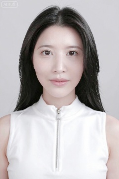This is a photograph of an East Asian woman with fair skin, straight black hair, and a slender physique. She has a round face, almond-shaped brown eyes, and full lips. She wears a sleeveless white top with a high collar and a zipper detail. Her makeup is subtle, with a natural look. The background is a plain, light grey. The overall image has a soft, professional quality, focusing on her serene expression and elegant appearance.