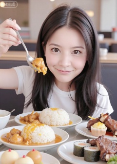 This image is a high-resolution a little girl,smirk,long straight black hair,large brown eyes,real photo,front view,She wore a white clothes. She holds a spoon aloft,laden with food,and her expression is one of slight amusement. The table is full of various delicious dishes,including chicken curry rice,cheese balls,cheese ribs,cheese cupcakes,steak,sushi,etc. The background is a restaurant.,