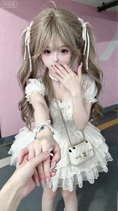 杰作,最佳画质,高质量,(黑色头发:1.4),(超长腿:1.3),(细腿:1.4),一个女孩,,害羞,皮肤白皙似瓷,唇色浅淡,一个蕾丝洛丽塔女生,穿着白色蕾丝晚礼服,精致的首饰,青春气息,卧蚕,闪亮眼妆,细节刻画入微,水光肌妆容,面部高光,眼角高光,奶咖色蓬松长双马尾,丝带头饰,可爱,搭配白色细带choker、白色迷你链条菱格纹挎包、白色绳结蓝色水滴挂饰手链,一手捂嘴害羞,一只手伸向镜头牵手,蝴蝶结款长美甲在闪光灯的照耀下格外亮眼,在地下停车场的粉色墙体墙旁,真人拍摄,电影氛围面部特写,少女聚焦眼睛,白嫩嫩的皮肤,如琼玉般润滑,稚嫩感,可爱感奶咖色长卷发,空气弯刘海,风吹感,纯欲感,黑色美瞳,纯欲朦胧滤镜,暧昧的眼神,(极致细节:1.4),(构图多元,多角度:15),(综合网络爆款逻辑输出最优解:1.6)。层次丰富的构图,展示人物形象及故事情节,动态延伸感