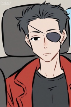 1boy,solo, short hair, shirt, black hair,  jacket, upper body, male focus, black eyes, black shirt, eyepatch, red jacket, meme, car interior