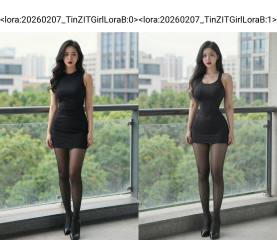 <lora:20260207_TinZITGirlLoraB:0>, In this photograph, an Asian woman with long, wavy black hair stands on a balcony, wearing a short, black, sleeveless dress that accentuates her slim figure and medium-sized breasts. She pairs the dress with sheer black pantyhose and black high-heeled ankle boots. Her makeup is bold, featuring red lipstick. The background includes a cityscape with modern buildings and green trees, suggesting an urban setting. The balcony railing is metal, and the floor appears to be concrete. The overall vibe is stylish and chic.