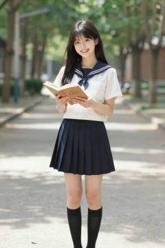 <lora:20260207_TinZITGirlLoraB:0>, A young Asian woman, estimated age range 18-22, stands gracefully on a paved pathway, smiling warmly. She wears a classic school uniform comprising a white short-sleeved blouse with a navy blue sailor collar and tie. Her skirt is a pleated navy mini-skirt, contrasting with the white blouse. She has long, straight black hair with a fringe, slightly covering her eyebrows. Her skin is fair, smooth and her eyes are dark. She holds an open book with a brown cover, her expression radiating joy. Her legs are slender, and she is wearing knee-high black socks. The path is lined with tall trees, casting soft shadows across the scene, indicating bright daylight. The background reveals a building in the distance, partially blurred. The overall lighting is natural and even, enhancing the colors and details. The composition is a medium shot, slightly from a low angle, enhancing her presence. The image conveys a cheerful, youthful, and vibrant mood, possibly a school setting, with an air of pleasantness. Art style can be described as detailed realism with soft, warm tones. long legs,