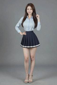 <lora:20260207_TinZITGirlLoraB:1>, A photograph of an Asian woman with long, straight, brown hair, standing against a plain gray background. She is wearing a light blue, long-sleeve button-up blouse with a fitted waist and a dark blue pleated skirt with white trim, accentuating her slim figure. Her skin tone is fair, and she is wearing beige high-heeled sandals. She has a confident smile, with one hand on her hip and the other touching her hair. The image is well-lit, emphasizing her youthful and professional appearance, long legs,
