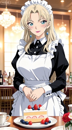 1girl,jewelry,earrings,solo,maid,maid headdress,cake,apron,food,enmaided,smile,breasts,maid apron,looking at viewer,dress,large breasts,bottle,blue eyes,black dress,cup,white apron,blush,9,