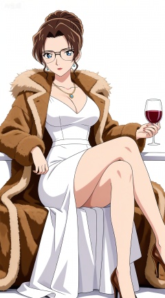 1girl,solo,dress,breasts,fur coat,sitting,drinking glass,cup,high heels,wine glass,jewelry,coat,blue eyes,necklace,crossed legs,shoes,simple background,white dress,white background,cleavage,