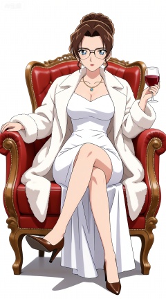 1girl,solo,dress,breasts,fur coat,sitting,drinking glass,cup,high heels,wine glass,jewelry,coat,blue eyes,necklace,crossed legs,shoes,simple background,white dress,white background,cleavage,