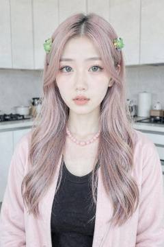 This is a photograph of a young Asian woman with fair skin and long, wavy, pastel pink hair. She has large, expressive blue eyes, and her lips are slightly parted. She wears a black top under a light pink jacket, and a pink bead necklace. Her hair is adorned with colorful hair clips, including a green frog. The background shows a modern, minimalist kitchen with white cabinets and a stove. The overall mood is casual and cute.