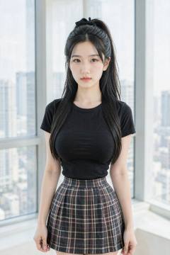This is a photograph of a young East Asian woman with fair skin and long, straight dark hair tied in a high ponytail with a black ribbon. She has a petite frame with a small bust and is wearing a black, fitted short-sleeve top and a high-waisted plaid skirt. Her makeup is minimal, highlighting her natural beauty. She stands in front of a large window showing a cityscape with tall buildings. The room is brightly lit, suggesting daytime.