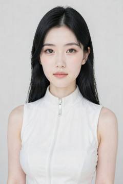 This is a photograph of an East Asian woman with fair skin, straight black hair, and a slender physique. She has a round face, almond-shaped brown eyes, and full lips. She wears a sleeveless white top with a high collar and a zipper detail. Her makeup is subtle, with a natural look. The background is a plain, light grey. The overall image has a soft, professional quality, focusing on her serene expression and elegant appearance.