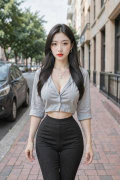 The image is a high-resolution photograph of a young East Asian woman standing on a city street. She has a fair complexion and long, straight, dark brown hair that falls past her shoulders. Her facial features are delicate, with large, expressive eyes, a small nose, and full lips painted with a bold red lipstick. She is wearing a light gray, button-up blouse that is unbuttoned at the top, revealing a hint of her cleavage. The blouse is slightly cropped, exposing her midriff, and has three-quarter sleeves. She pairs this with black pants that fit snugly, showcasing her slim waist and hips. She accessorizes with a delicate silver necklace featuring a small pendant and small hoop earrings. Her outfit is casual yet stylish, emphasizing her slender figure. The background features a city street with a mix of urban elements: a parked car on the left, a sidewalk with red-brick paving, and a building with beige walls and a black railing. The sky is clear, and green trees line the street, adding a touch of nature to the urban setting. The overall mood of the image is modern and chic, capturing a young woman confidently striding through a bustling city.