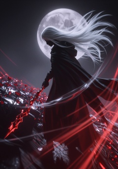 CG质感,超清画质,笼罩在黑暗中的哥特黑色法袍,极暗,有角度的地面开满荧光的反光的血红色花海,巨大的居中血色满月背景,白色长发晶莹发丝光,一把长柄的能量弥散的失真的流体的非规则的红色能量多形态光能武器,战斗姿态,冷酷,暗红色调,朦胧感,漠视感,低头面部阴影,身体阴影,红色速度流光线条光,动态模糊,震撼,大师杰作,模糊,朦胧光描边,强阴影,夜晚,广角,景深,压低亮度,低亮度,朦胧感,无光环境,阴暗故事氛围,幽冷,冷调系,ue5渲染,侧面,侧身照人物特写,强对比,镜面折射,景深,深红与黑色强对比,红光弥散感,电影级特效,凌乱,大风,衣摆与发丝断续与破碎摆动动态模糊呈现速度张力,强力,特效张力十足,层次感光线,细节清晰,高品质,超清画质,高挑,修长,日系风格,暗红色环境光,动态模糊,速度感,时间迁越次元,逆光,伦勃朗光,特写镜头,花瓣飞舞前景,神器级武器特写动态模糊,发丝微微飘动,衣摆微微飘动,下半身周围,透明少量的慢慢飞舞的细微的火红色飘散的灰烬特效,