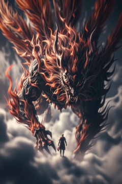 YY Anime style,CG质感,以玄幻风格呈现的古代朱雀的特写,风云构成神兽,云雾缭绕且凶猛翻滚,低下头俯视着渺小的人,色彩丰富,夸张惊悚恐怖的压抑的气氛。细节拉满,虚拟引擎,动态模糊边缘虚化,强烈胶片颗粒与高噪点质感,弥散晕染的暗部层次,夸张扭曲的人物轮廓,超现实景深控制,细节生动完美,8K级暗调摄影。全景镜头,全身动态动作,景深效果,倾斜失衡构图,巨型比例,C4D建模,Blender制作,虚幻引擎,Octane渲染,全局光照,光线追踪反射,屏幕空间环境光遮蔽,着色器,快速近似抗锯齿,电脑生成图像,实时光线追踪,视觉特效,4K画质,最佳品质,超精细,超写实,火焰奇幻,暗黑风格,粗粝质感,微妙色调。