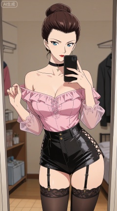 1girl,breasts,jewelry,phone,earrings,thighhighs,choker,solo,cleavage,cellphone,black choker,holding phone,bare shoulders,holding,smartphone,shirt,garter straps,black thighhighs,off-shoulder shirt,leotard,frills,selfie,collarbone,off shoulder,pink shirt,long sleeves,cross-laced clothes,standing,clothes hanger,closed mouth,cowboy shot,high-waist shorts,thighs,indoors,large breasts,see-through,shorts,medium breasts,